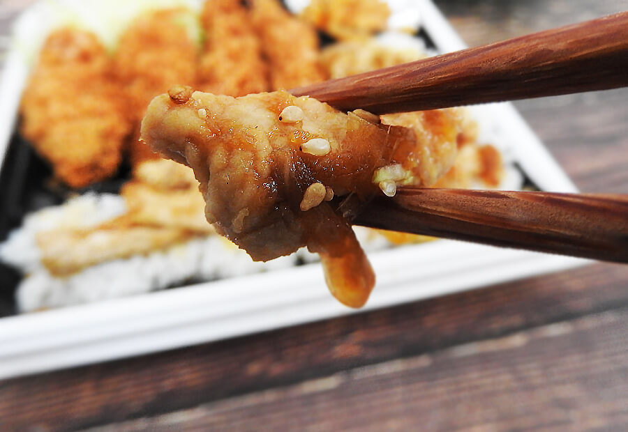 一口大のお肉にはおろし生姜がたっぷり。お弁当のふたを開けた瞬間に生姜のにおいが鼻を突いてきましたので「しっかりと生姜がきいているタイプかな?」と予想しつつ実食。