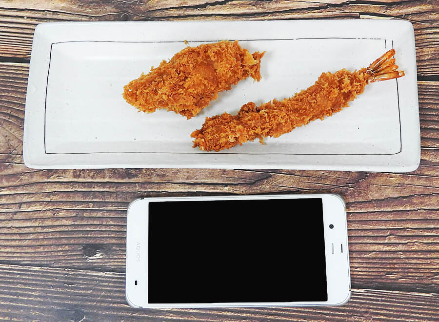 手持ちのスマートフォン(AQUOS SERIE SHV34:149×73×7.6mm)と比べてみると、長さ自体はスマートフォンと変わりません。海老フライ隣のカキフライがどしーんとしているため海老フライが小さめに見えますが、海老フライ単体を見ても「小さい」とは思いませんでした。