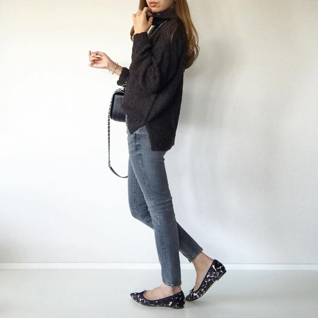 ゆるシルエットのタートルニットに合わせるボトムは、スキニーでほっそりと!