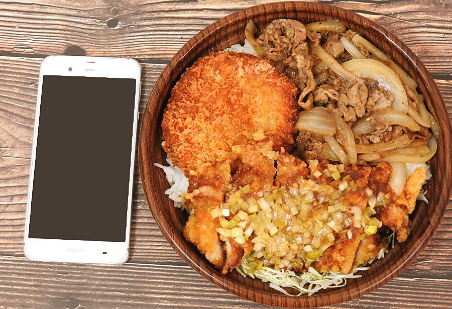 手持ちのスマートフォン(AQUOS SERIE SHV34:約149×73×7.6mm)と大きさを比較。縦横ともに肉トリプル丼の方が大きい……。