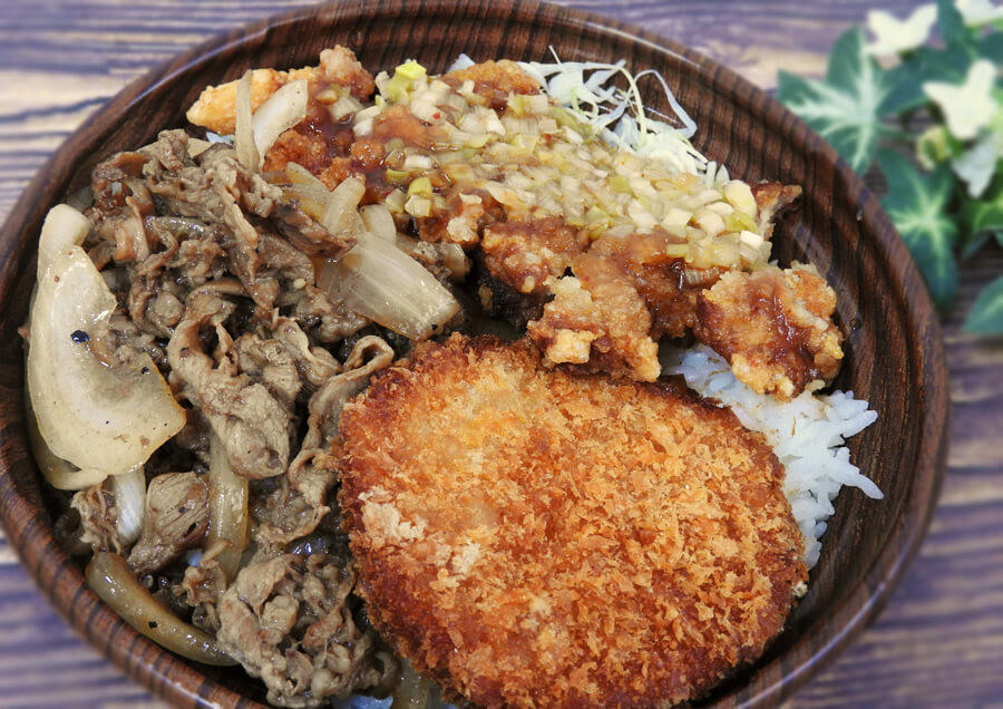 ボリュームに圧倒されてしまうキッチンオリジン「肉トリプル丼」925円(税別)。お値段を聞いた時には「お弁当1つに1000円位するの?」なんて思っていましたが、肉トリプル丼を目の当たりにすると、妥当な価格設定だと思いました。
