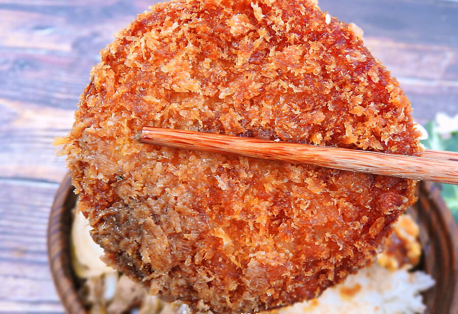 次はハムカツを……と思って箸でつかんでみると……重い……。重すぎ……。上の写真を撮るのに苦労するくらいに重く、人によってはハムカツ+ごはんだけで満足できそうなくらいの重量感でした。