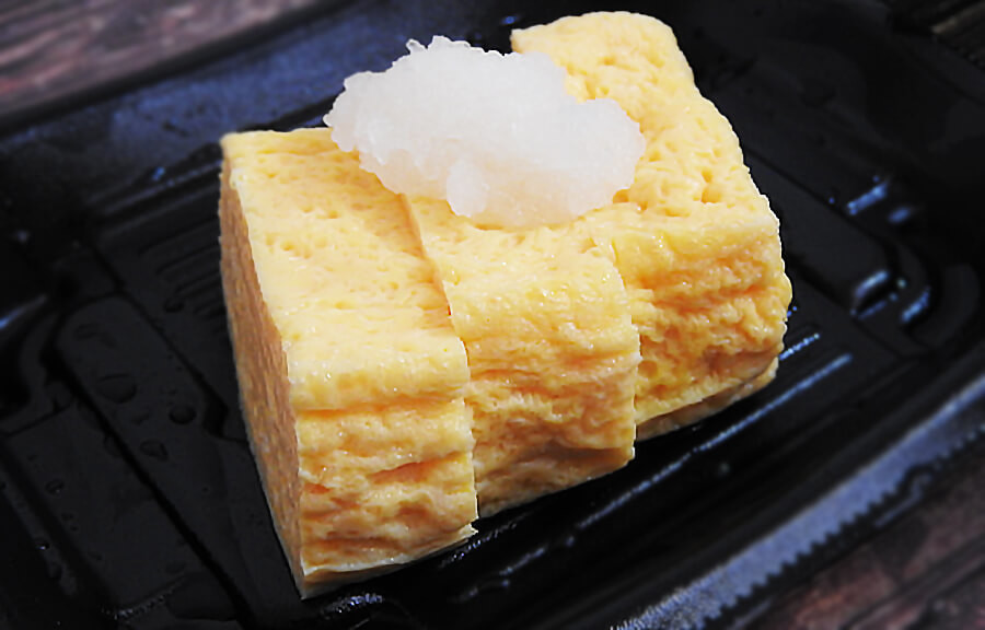 スシローでお寿司を食べていたら、おそらく注文しないであろう「だし巻き玉子」100円(税抜)を持ち買ってみました。3切れありますね。上には大根おろしがのっています。