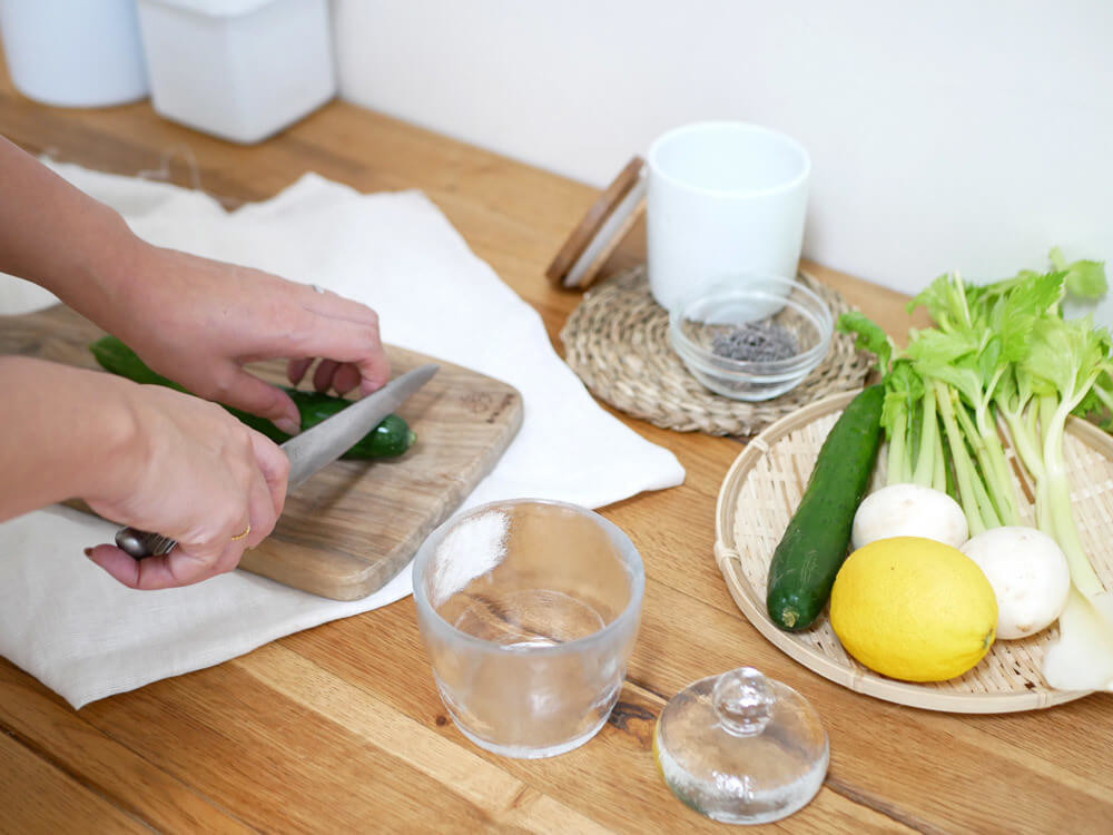 きゅうりやカブ、白菜になすなどのいつものお野菜に塩昆布、みょうが、唐辛子、ごま油などを足せば、もう立派な1品ですね。