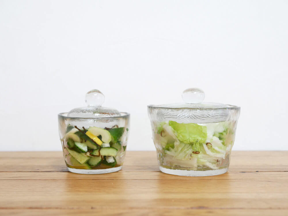 ガラスの透明感と涼し気な風合いは、食卓でのお漬物をよりみずみずしく美味しそうに引き立てます。