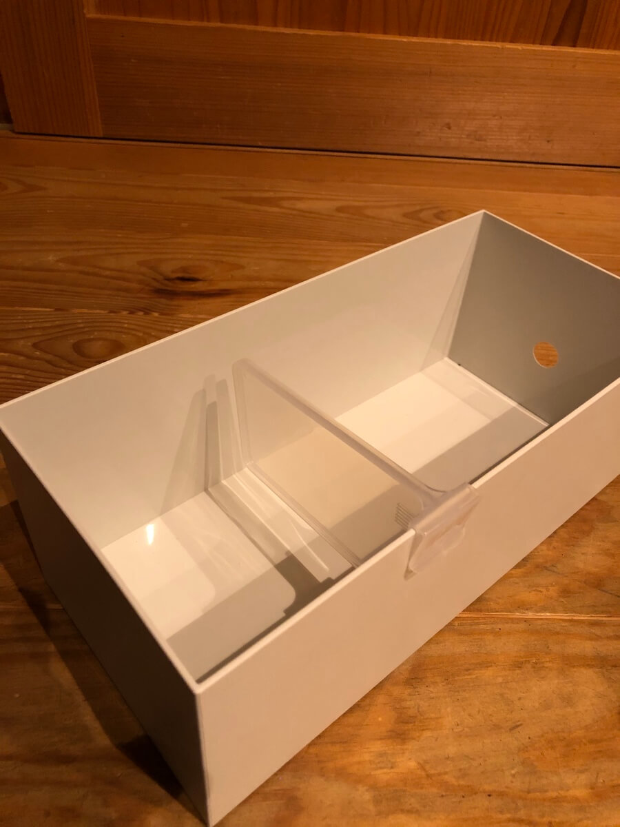 今回、セリアで見つけたものは、このドアポケット用の仕切りより大きなサイズ「バスケット用仕切り」でした。無印良品の収納ケースやカインズのオリジナル整理収納小物ケース・小物入れSkitto(スキット)にも使えるかもと買って使ってみました。