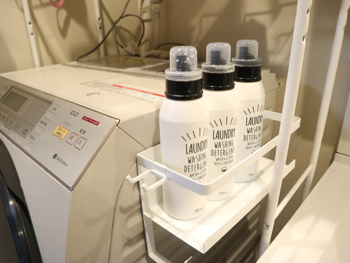見える収納なので、洗剤はスリコでお値下げされていたら100円のボトルに詰め替えておきます。