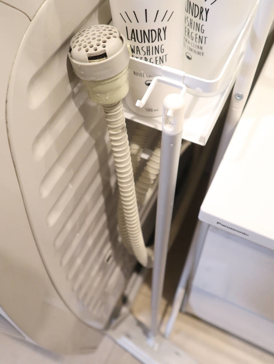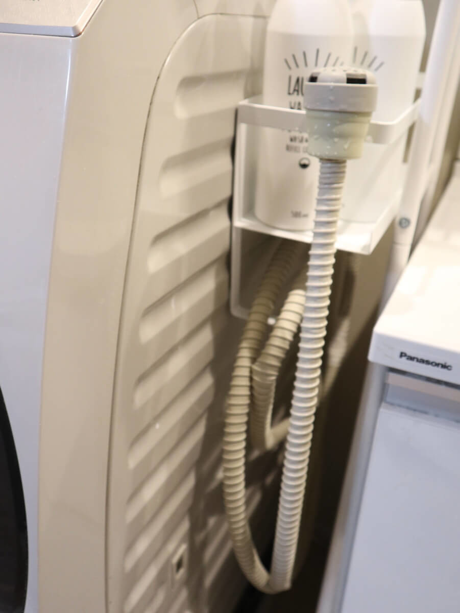 このマグネット収納のもう1つのいいところは、洗濯機の給水ホースがきちんと収納できること。