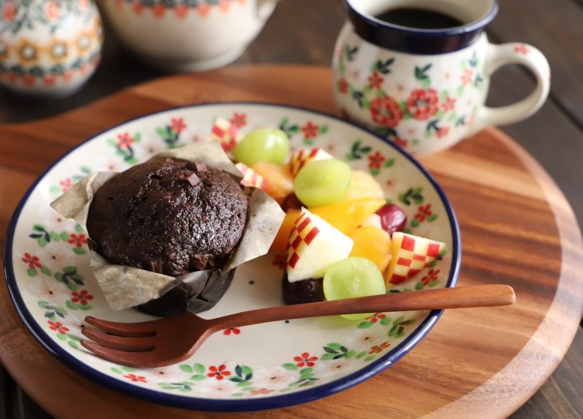 地味な色のマフィンだからこそ、色とりどりのフルーツを添えると気分もあがる!?かもしれません。