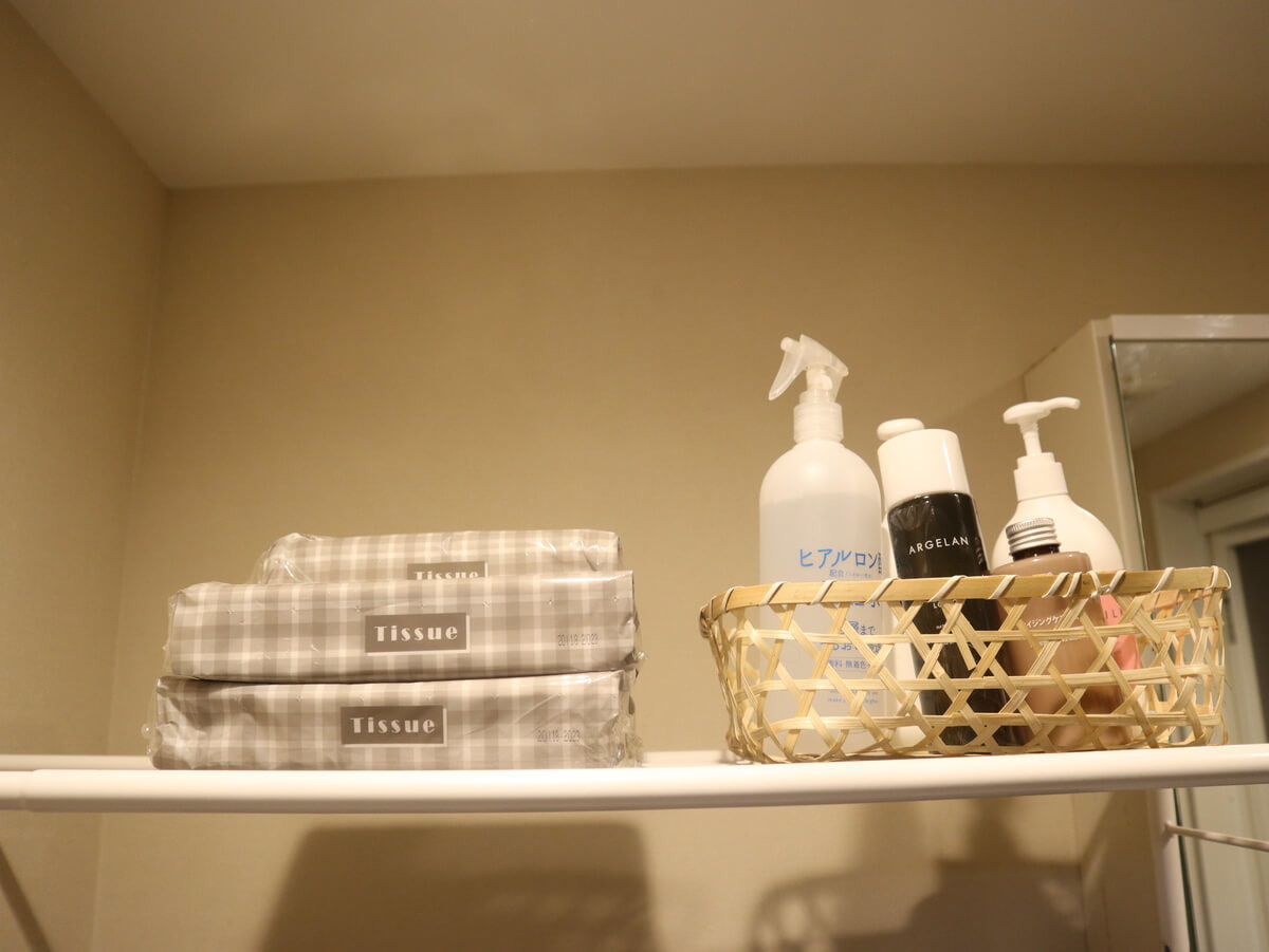 日用品やお風呂上りにすぐに使いたいスキンケアセット。 スキンケアセットはかごにまとめておくと取りやすく便利です。