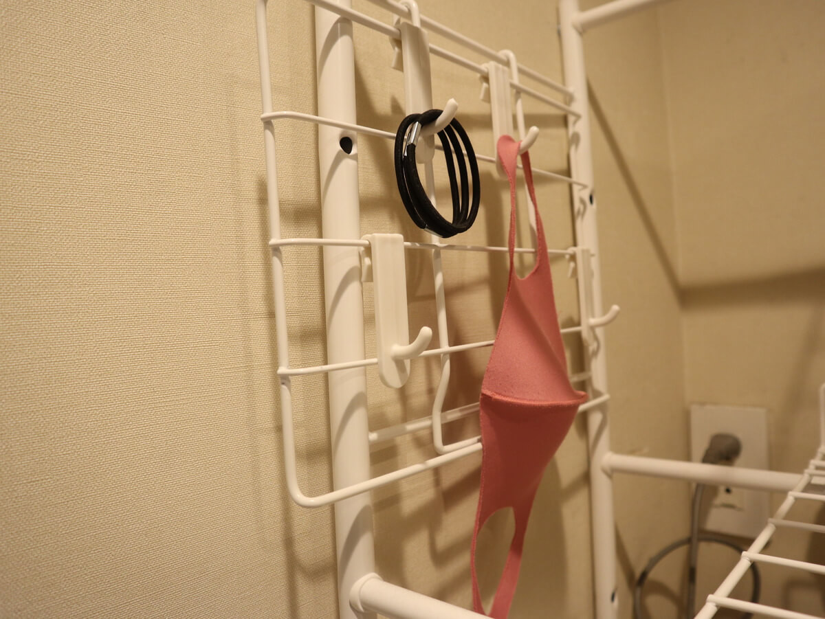 衣類をハンガーでかけて一時干しに使うこともできますし、S字フックなどを活用してつるすことも可能です。濡れたタオル、バスマットなどを干しておくこともできます。