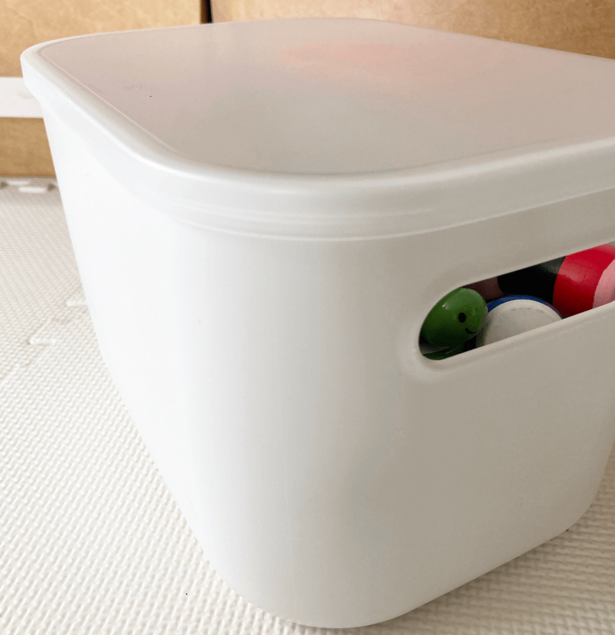今はおもちゃ入れとして使っていますが、この小さめのサイズ感もポイントで、子どもがひっくり返して全部出してしまっても、片付けがラクなのでそれほどイラッとせずに済みます♪