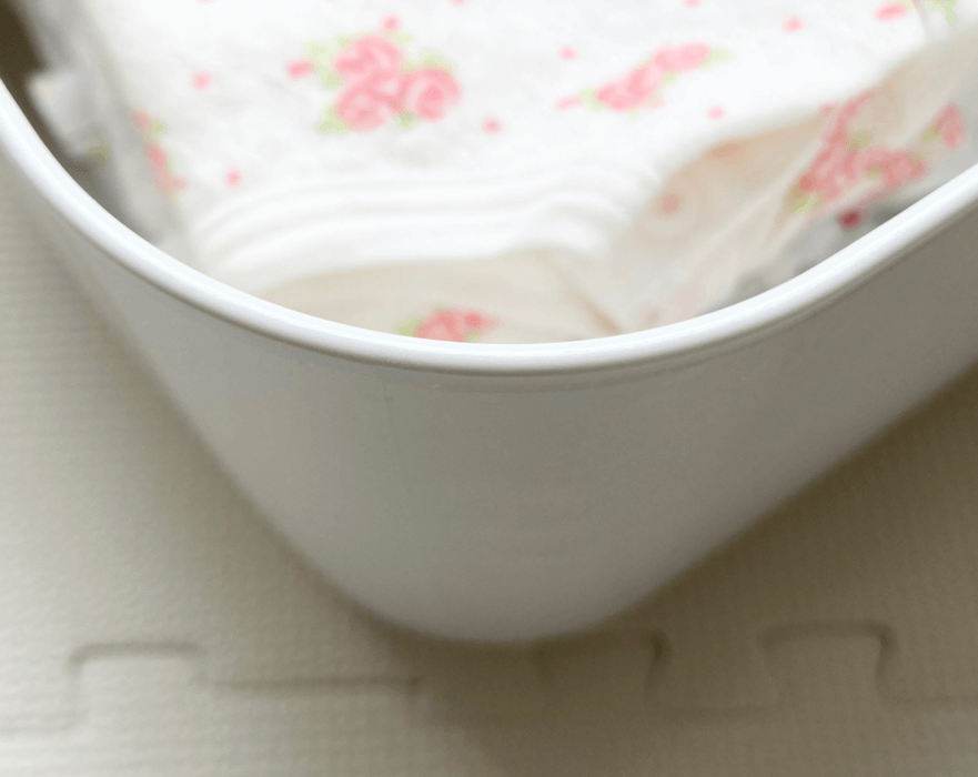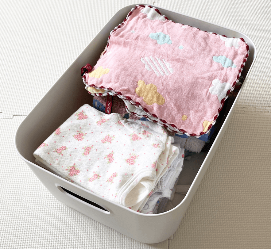中サイズは、毎日使う保育園用のハンドタオルやエプロン、肌着を入れています。衣類を収納しているチェストに入りきらなかったので『やわらかポリエチレンケース』を追加購入しました。