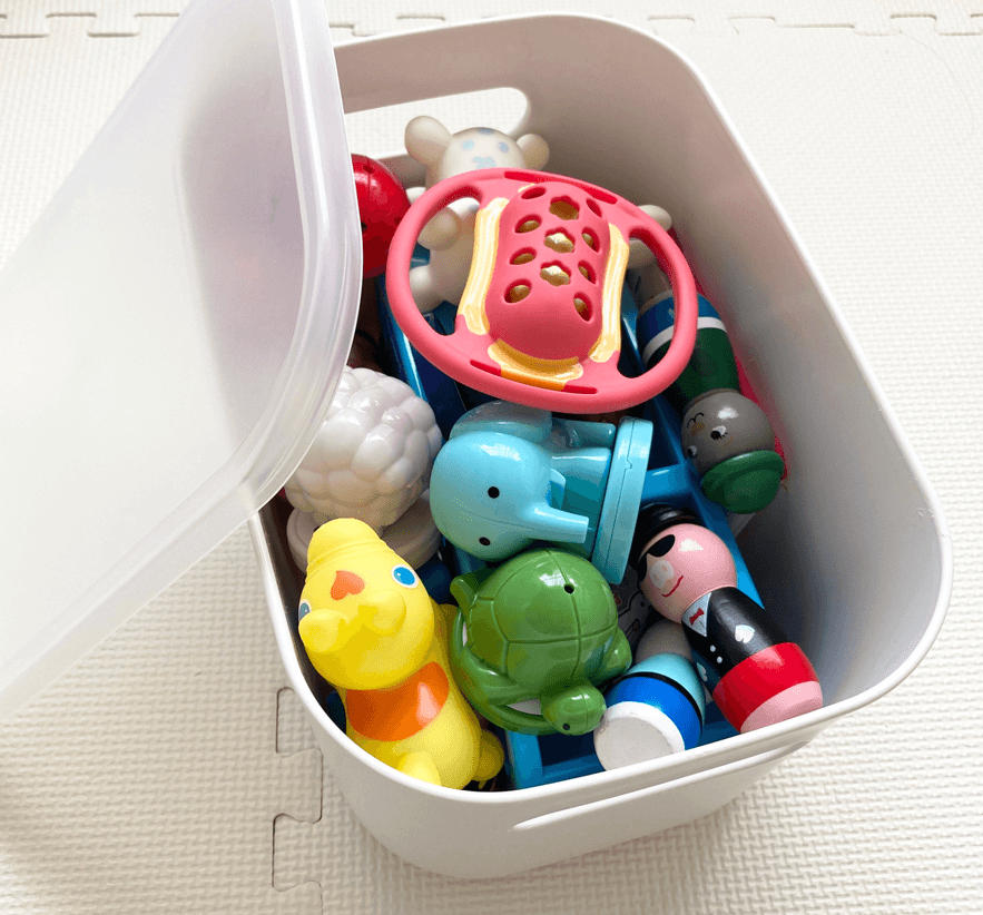 わが家ではベビーのおもちゃ入れとしても活躍している『やわらかポリエチレンケース』。 月齢が低いうちはよくおもちゃを口に入れて舐めたりするので、できるだけこまめに除菌シートで拭いたり、洗ったりと気を使うわけですが、このケース自体もするんと手軽に拭ける点が気に入っています。