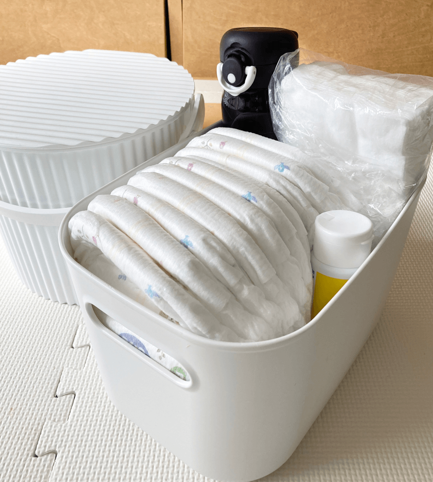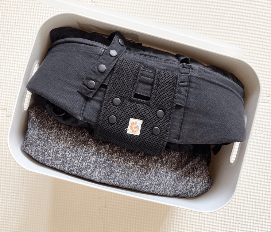 大サイズには、抱っこ紐、裏ボアの防寒ケープ、おんぶ紐がちょうどよく収まりました! さっと外出できるよう、最初はフタをせずオープンに使っていましたが、ベビーがいたずらでポイポイ取り出すようになってからフタも購入。フタはパカッと簡単にかぶせるタイプなので、開閉も苦ではありません。