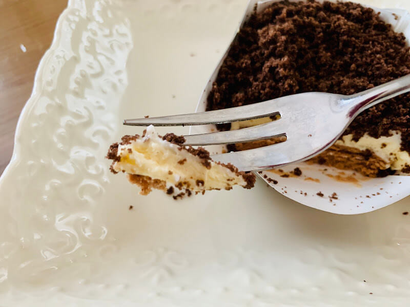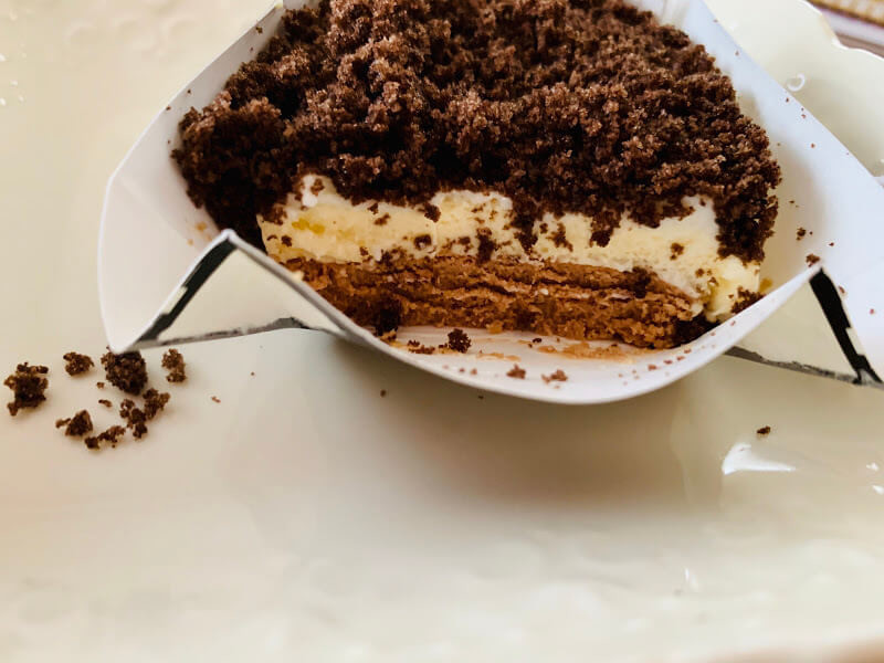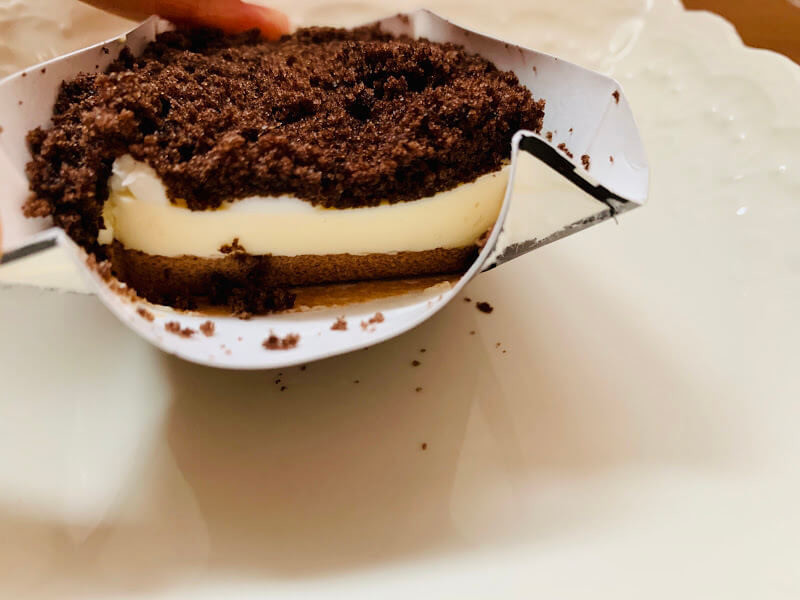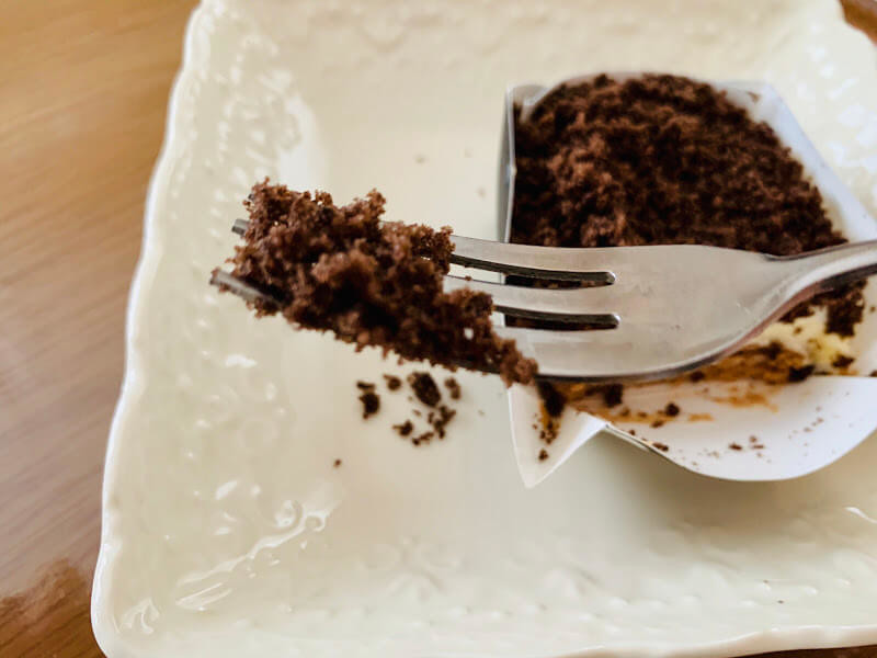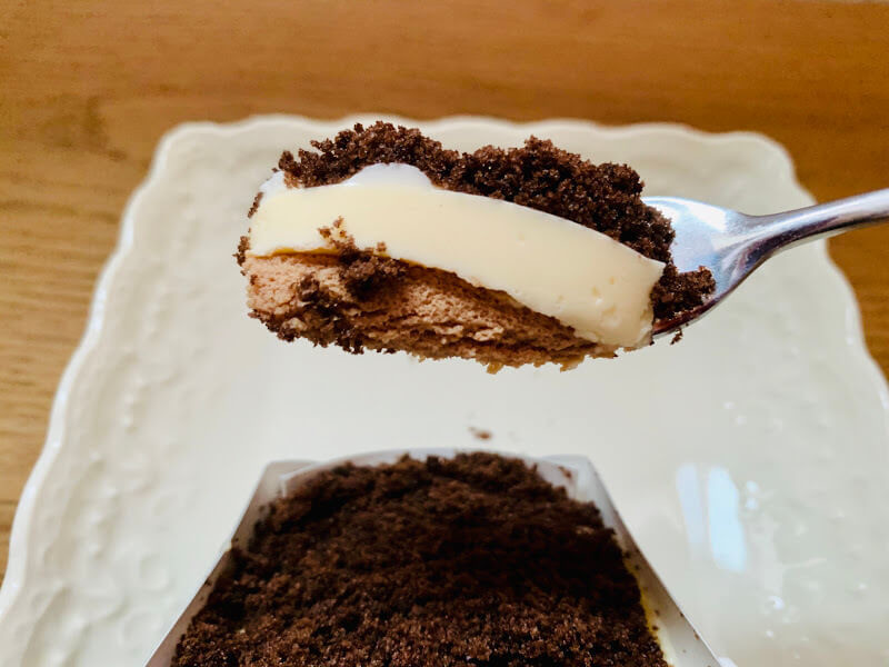 ココアスポンジクラムがふっわふわで、結構たっぷりとかかっているので、3層一気に食べるとまるでスポンジケーキのよう。それぞれの層が違った食感&味で美味しい!