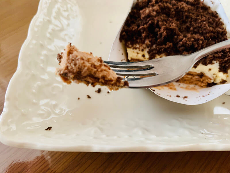 最後にベイクドショコラチーズケーキ部分を。こちらはベイクドというだけあって、レアチーズムース部分よりもしっかりとした食感です。味は最初にミルクチョコレートの優しくまろやかな甘みを感じます。しかし!その後にチーズの爽やかでキュッと引き締まるような酸味を感じました。