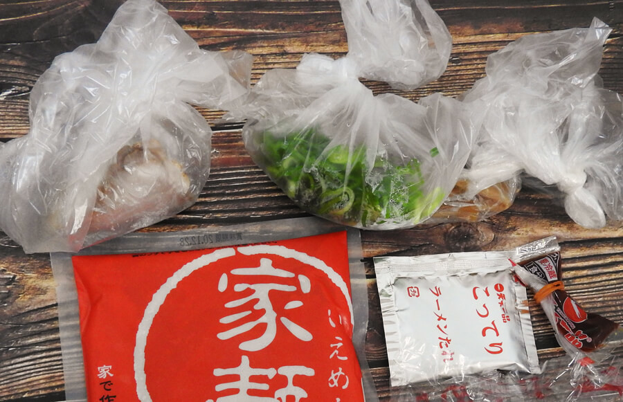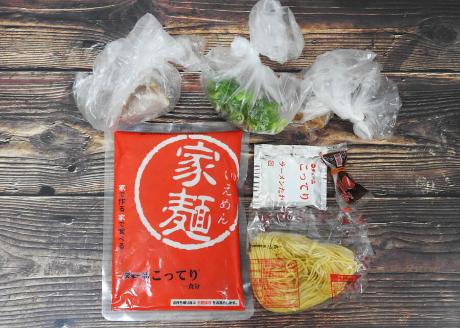 - 家麺一式(麺・スープ・たれ・調味油・からし味噌・にんにく薬味)