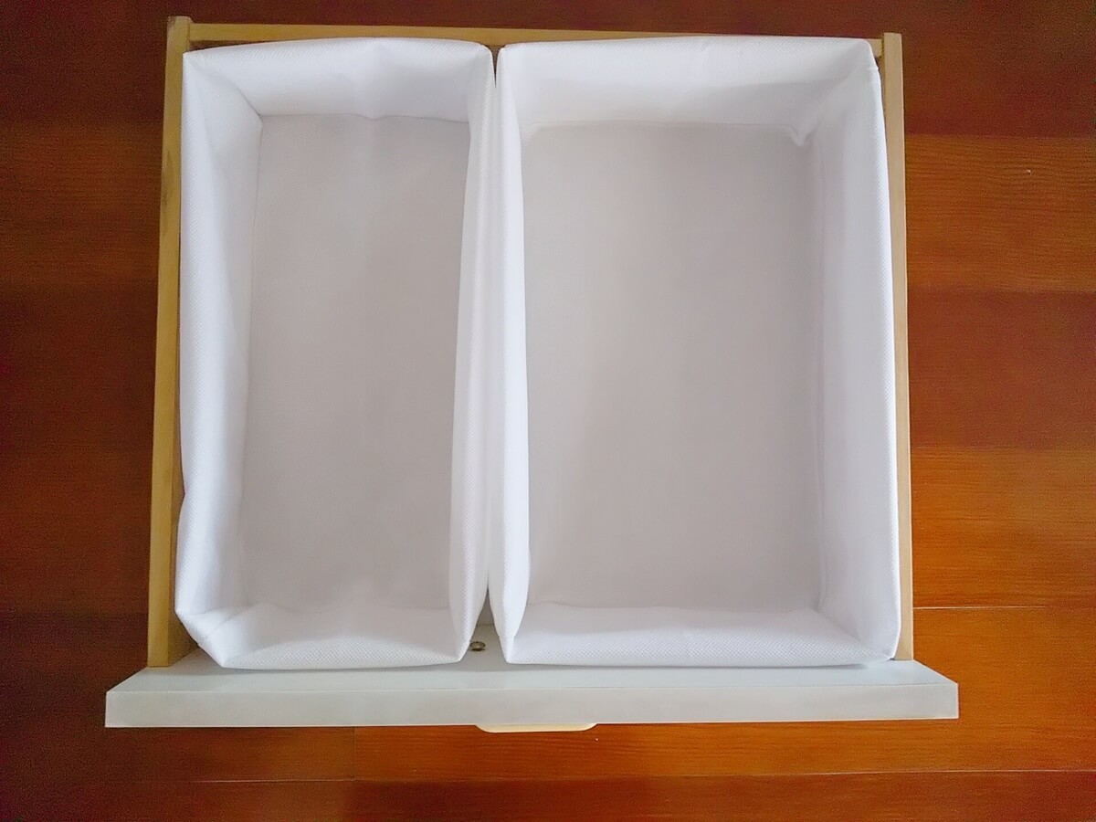 プラスチックのケースや紙袋など、野菜が分類できるグッズは他にもありますが、私のニーズに合ったのはこの仕切りケースでした。 その理由は“素材”にあり。不織布のメリットは、通気性がよいことと、柔らかいので形が変えられること。 通気性がよいので野菜の鮮度はそのままキープ。 その時ある野菜に合わせて臨機応変に形を変えられるので、無駄な隙間も作りません。大きなキャベツが入らない!デッドスペースができる!といったイライラがなく、ストレスフリー。 柔らかい素材ですがきちんと自立するので、使うたびに手で広げる手間も不要です。