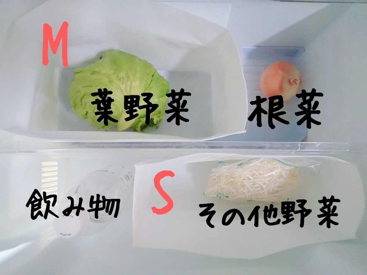 野菜類は大雑把に、葉野菜、根菜、その他の野菜に分類。 Mサイズの仕切りケースはキャベツやほうれん草などの葉野菜用に、Sサイズは葉野菜スペースに入らなかったその他の野菜を入れています。