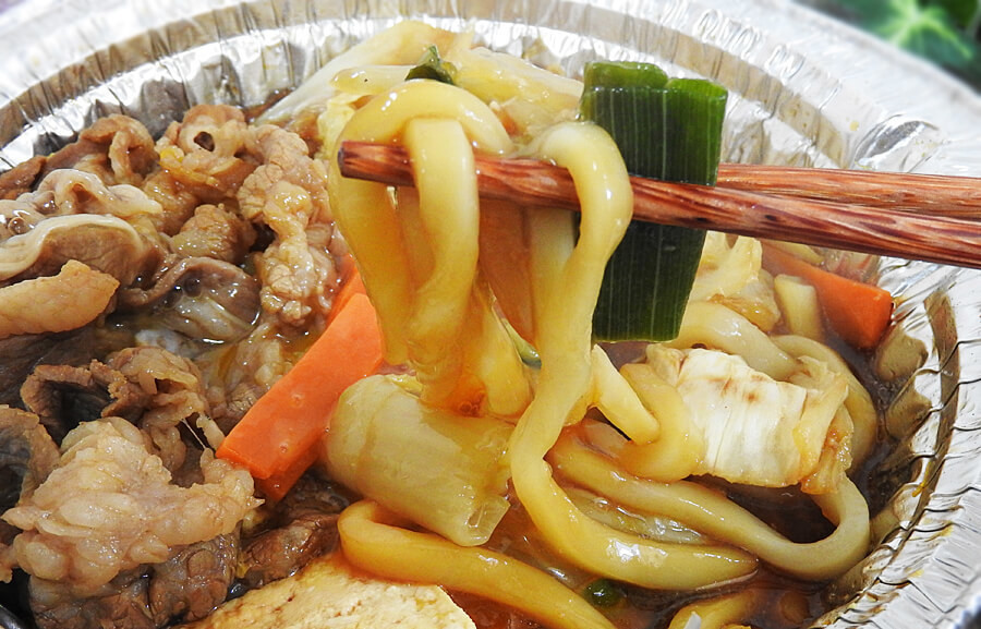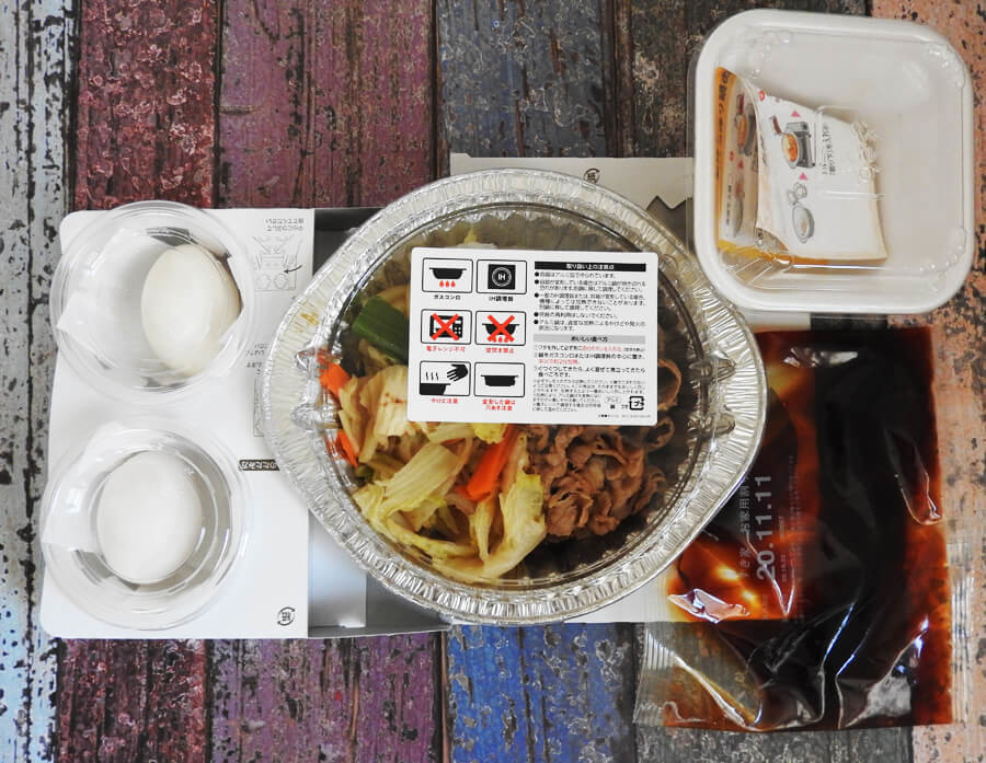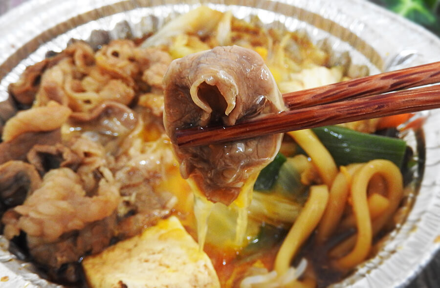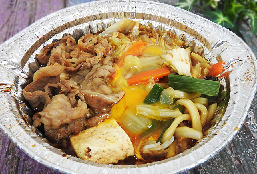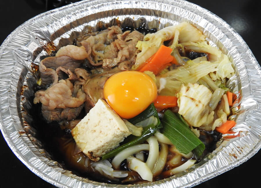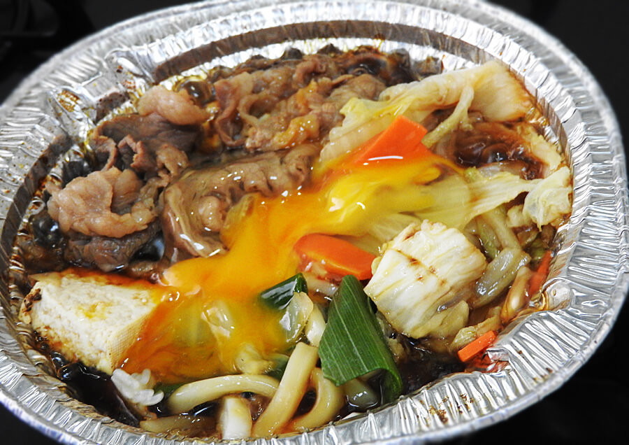「牛すき鍋定食」は、食べる前に加熱するとアツアツの状態で楽しめますよ。