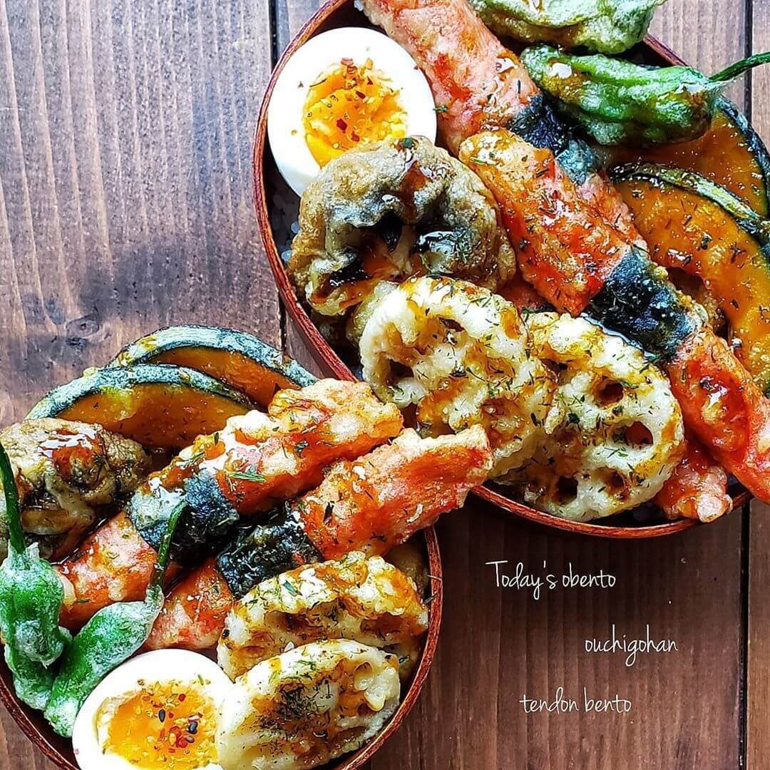 @halu1103さんのお弁当は豪華な天丼です。 木製の丸いお弁当箱が、天丼によく似合っています。