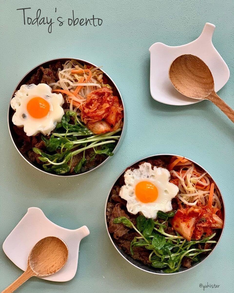 目玉焼きはお花の型を使っていて、可愛すぎて食べるのがもったいないですね!ビビンバ丼には、丸いお弁当箱がよく似合います◎