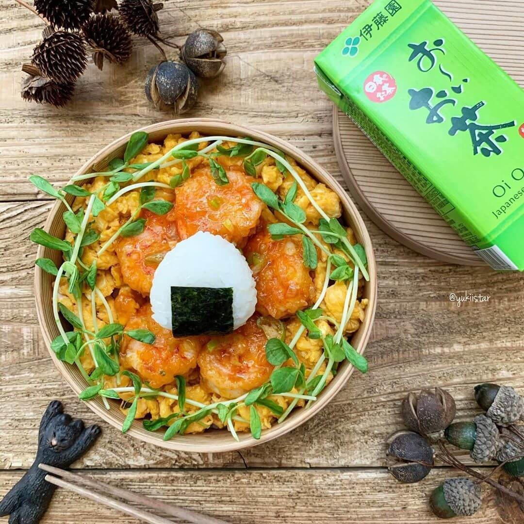 こちらもヨムーノメイトの@yukiistarさんのお弁当で、豪華なエビチリ丼です。 上にのっている小さなおにぎりが可愛すぎて、思わずにっこり♡