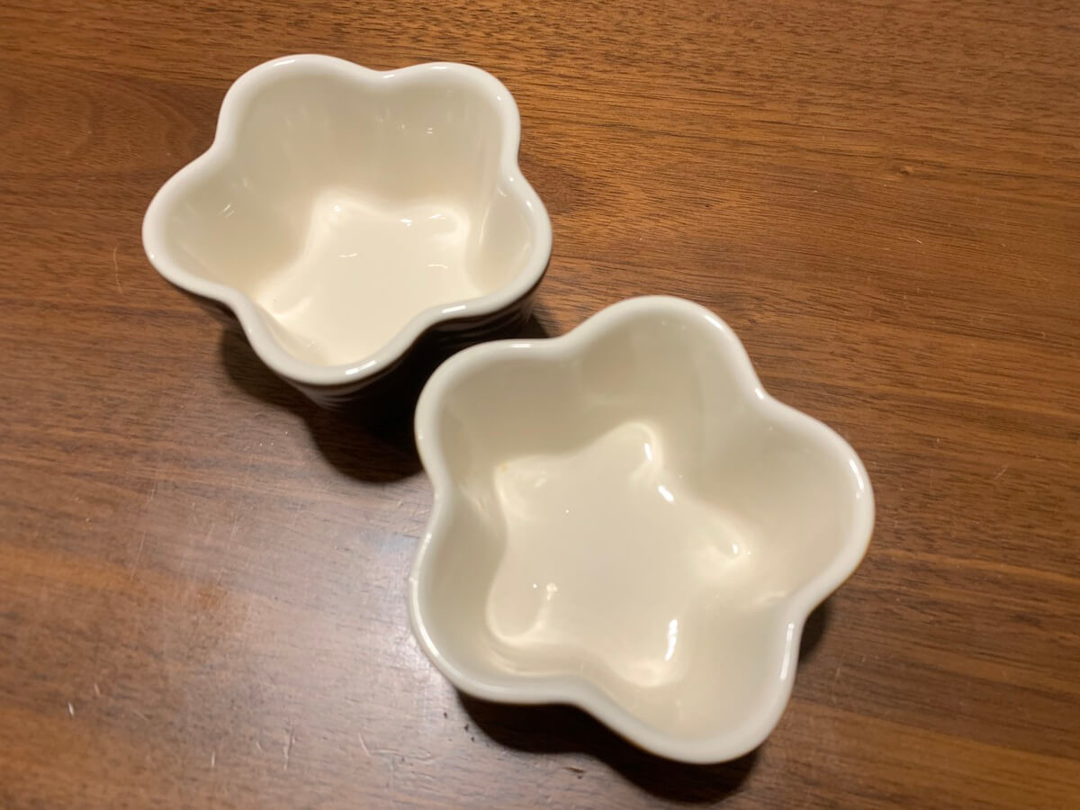 ココットと言えば、白色で円柱型のお皿が定番ですが、ダイソーやセリアには、さまざまな形状のかわいいココットがたくさん販売されています。