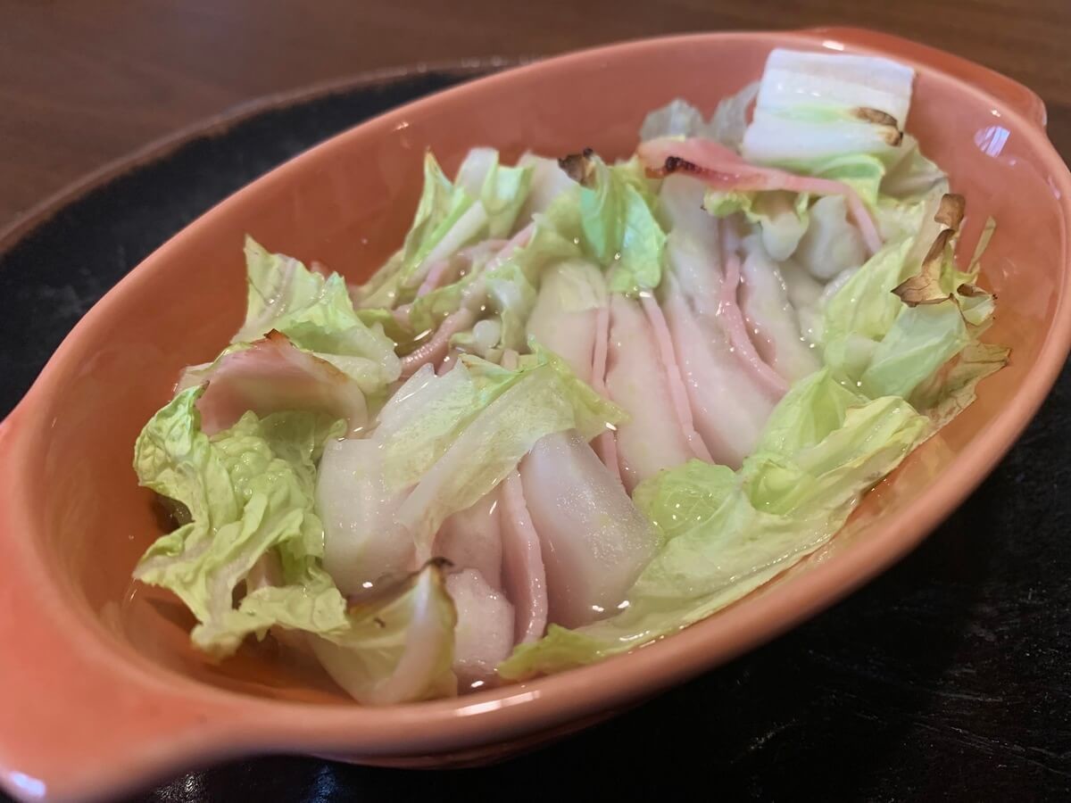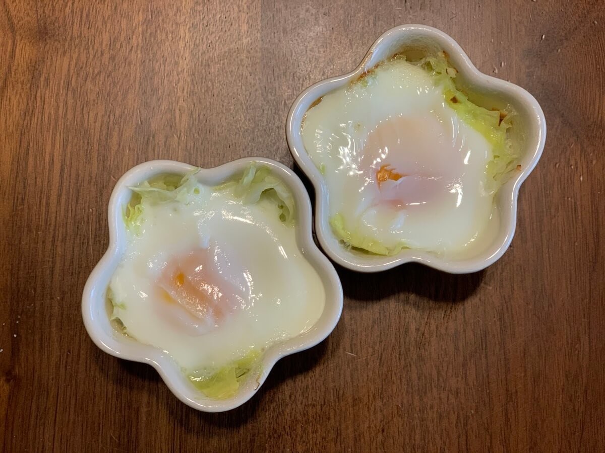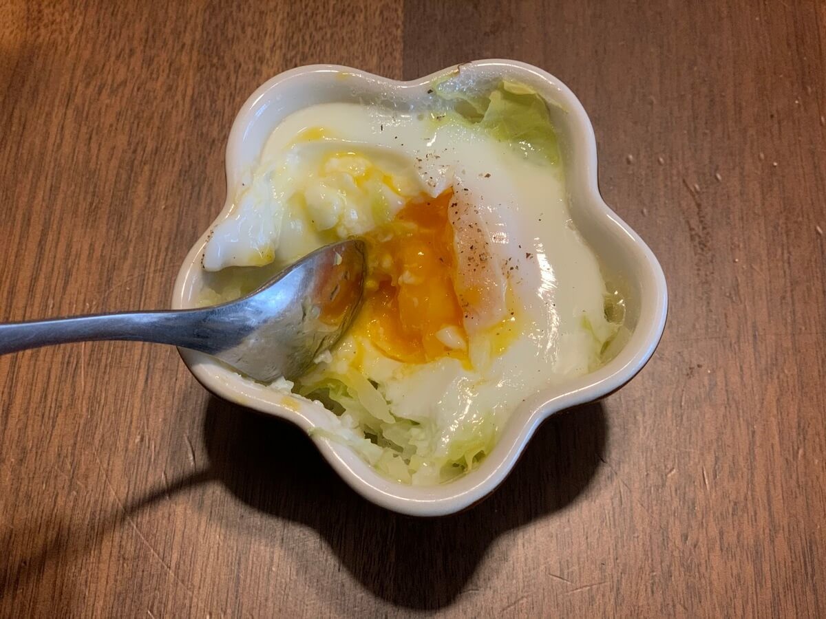 千切りにしたキャベツに生卵を落とし、アルミホイルで蓋をして、グリルで7分程度加熱すれば完成しました。塩と胡椒をふるだけで美味しい!