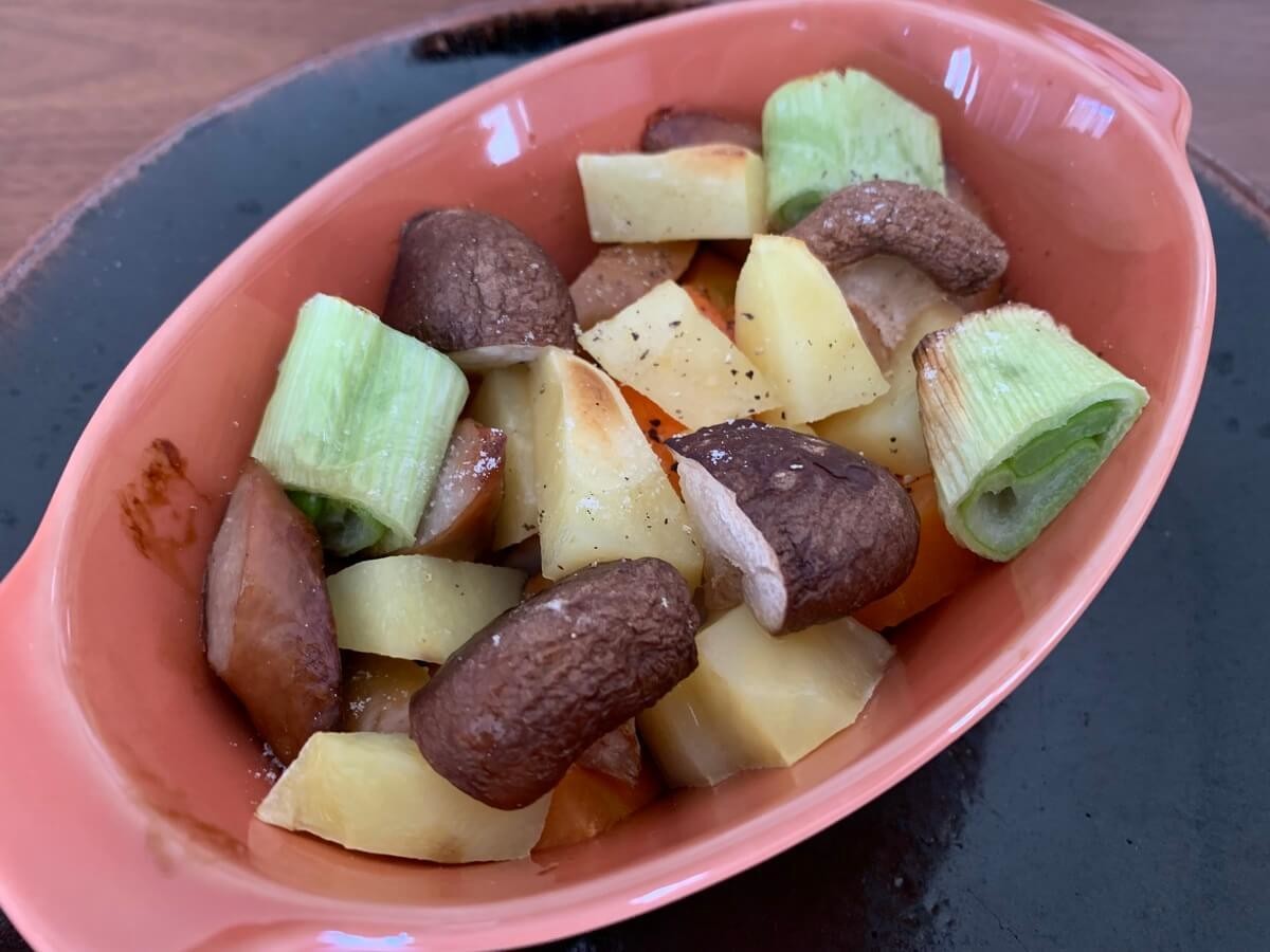 冷蔵庫の残り野菜とソーセージやベーコンを一口サイズにカットし、グラタン皿にぎゅうぎゅう敷き詰めます。塩、胡椒、オリーブオイル少々を振って、グリルで加熱します。
