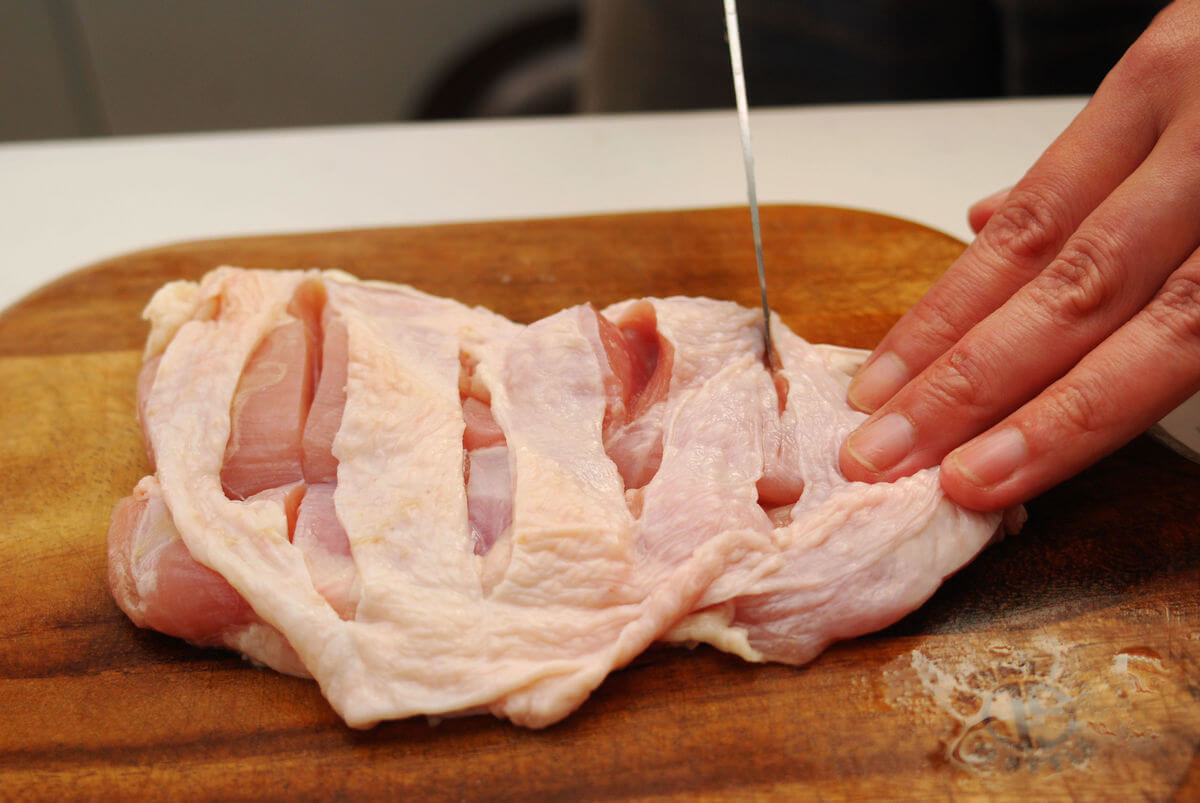 鶏肉は最初に皮を焼いてから、トマトでほろほろになるまで煮込みます。写真のように、あらかじめ皮目に切れ目を入れておくと、肉がほろほろになったとき皮もちょうどいい大きさにほどけてくれます。