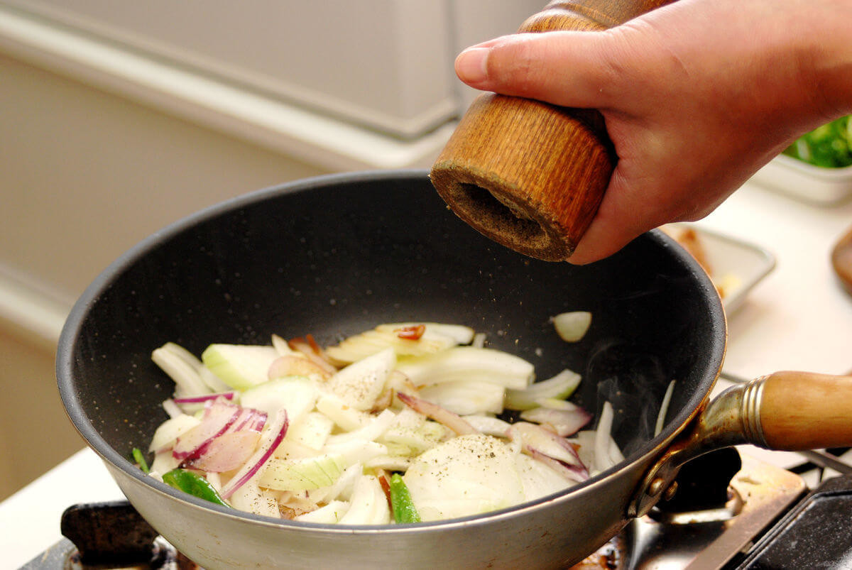 鶏肉を焼いたフライパンにカットした野菜を入れ、塩コショウをしたらそのまま炒めます。玉ねぎがしんなりするくらいまで炒めたら次の工程へ。