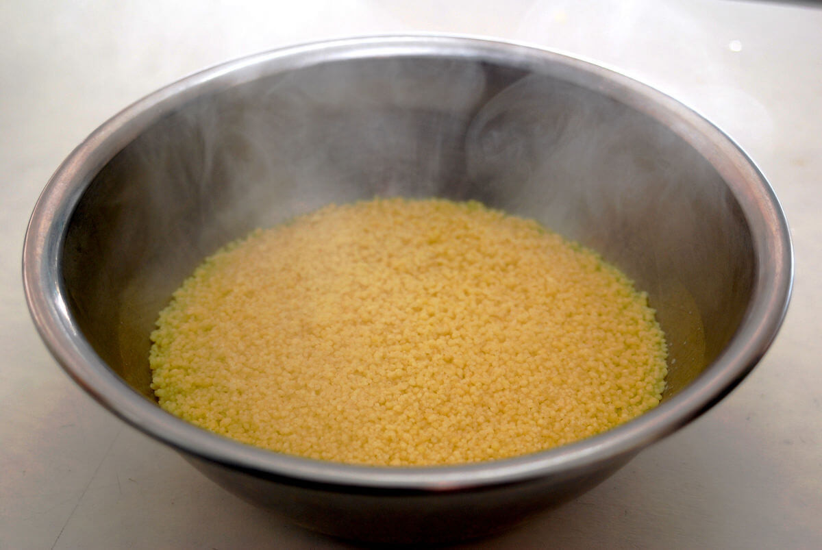 ボウルに入れたクスクスに熱湯を注ぎ、フタをして5分程度蒸らすだけで完成。クスクス1人前80g程度を目安に、量を調節してください。