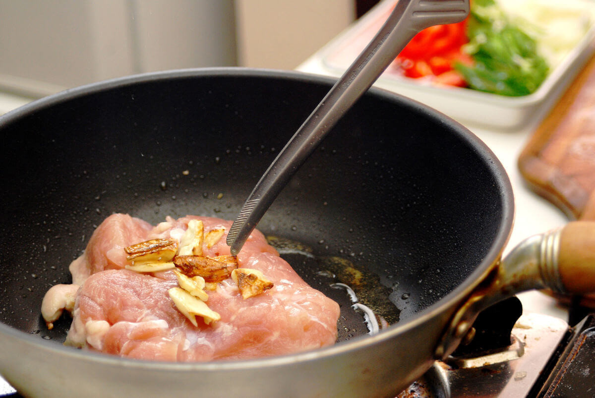 にんにくに焼き色がついてきたら、焦げないよう鶏肉の上に避難!