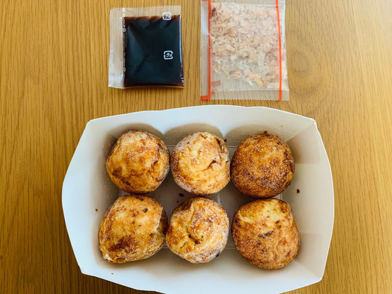 こちらが中身です。大きなたこ焼きが6個と、ソースと鰹節が添付されています。温める際は添付のソース類は外へ出しておきましょう!