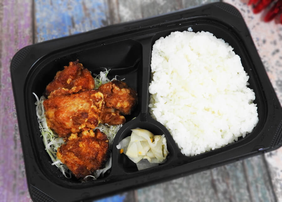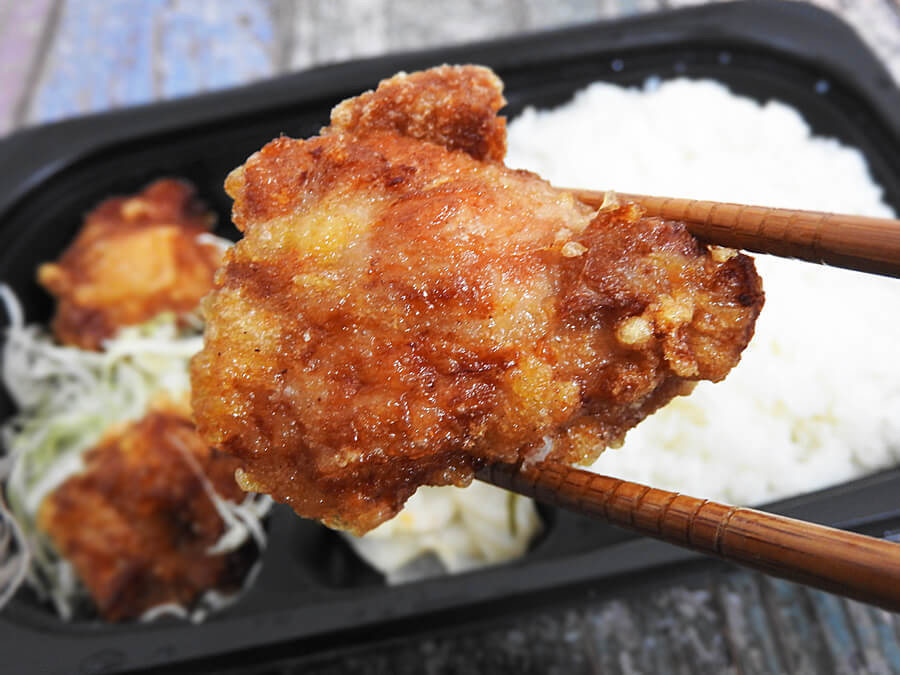 お弁当の中に入っている唐揚げは4つ。衣はカリカリとしていて、持ち帰りから30分経過していても、べちょっとなることはありませんでした。