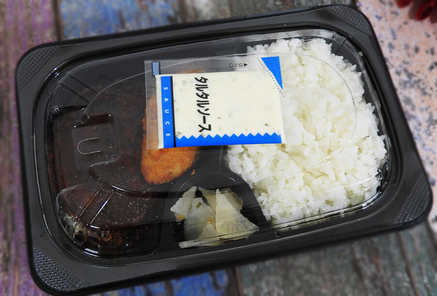 お手頃弁当をもう1つお持ち帰り。「ハンバーグ&白身魚フライ弁当」390円(税抜)です。タルタルソースがついていました。直接かかっているタイプではないんですね。