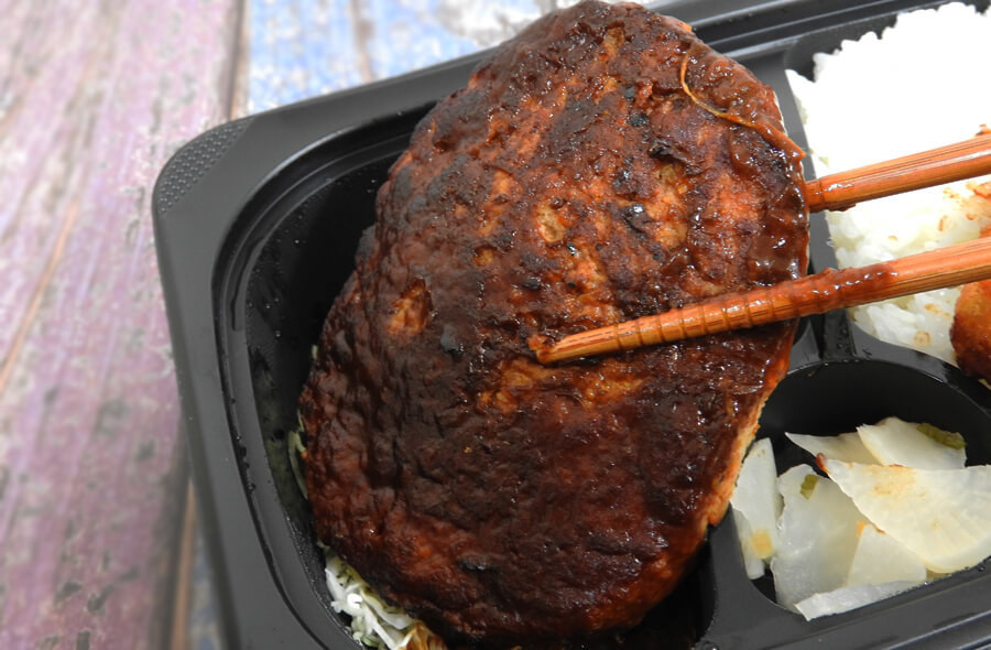 白身魚フライは全体的に柔らかく、おはしで持ち上げるとふにゃっとします。衣もふにゃっとしていて、なんだか頼りないですね。ハンバーグにかかっているデミグラスソースはべっとりついていましたので、タルタルソースなしでも味が染み込んでいました。