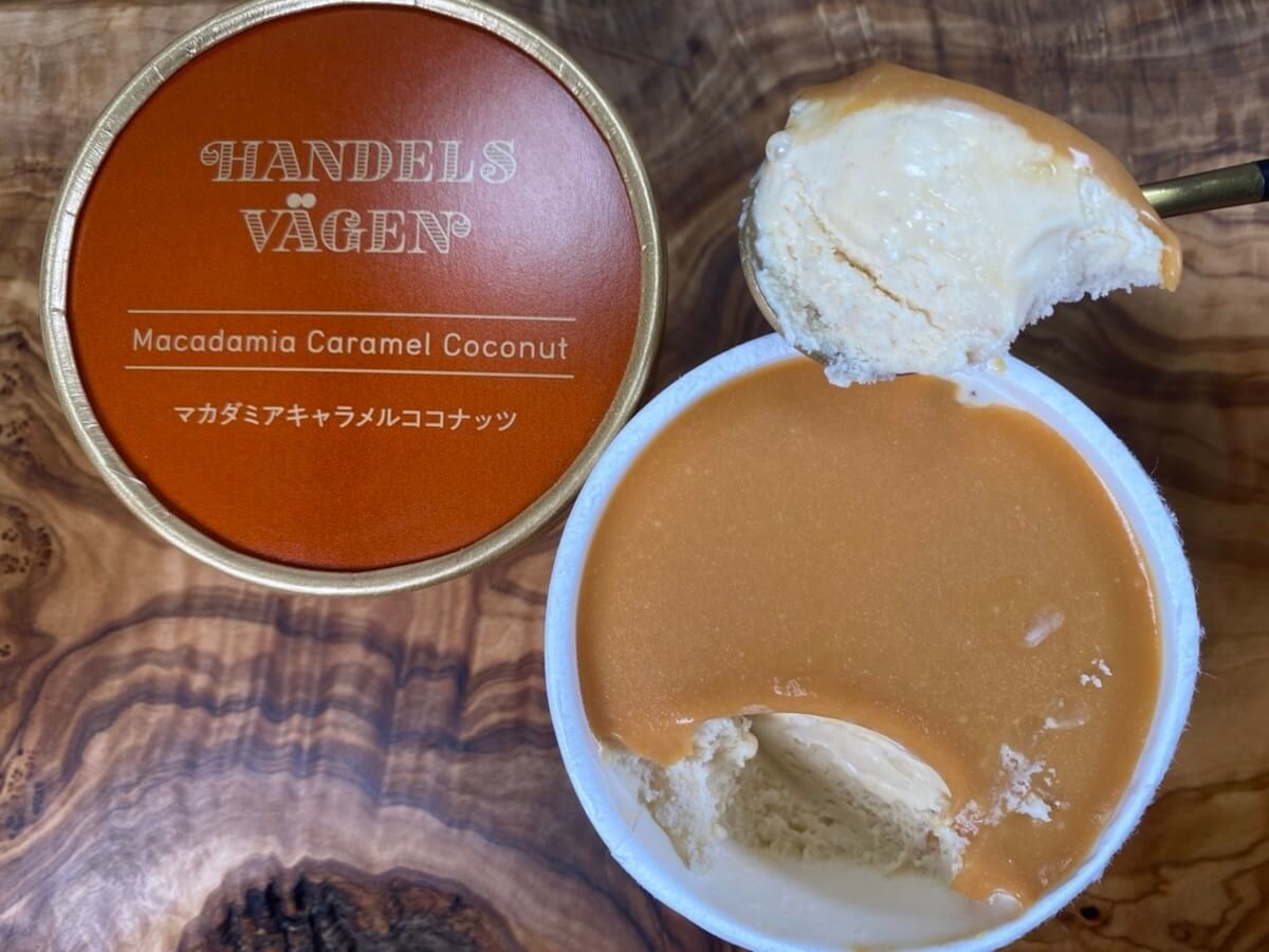 甘すぎず香ばしいキャラメルソースとマカダミアナッツの食感、だんだんと感じるココナッツの風味。珍しい組み合わせだけど、相性抜群!