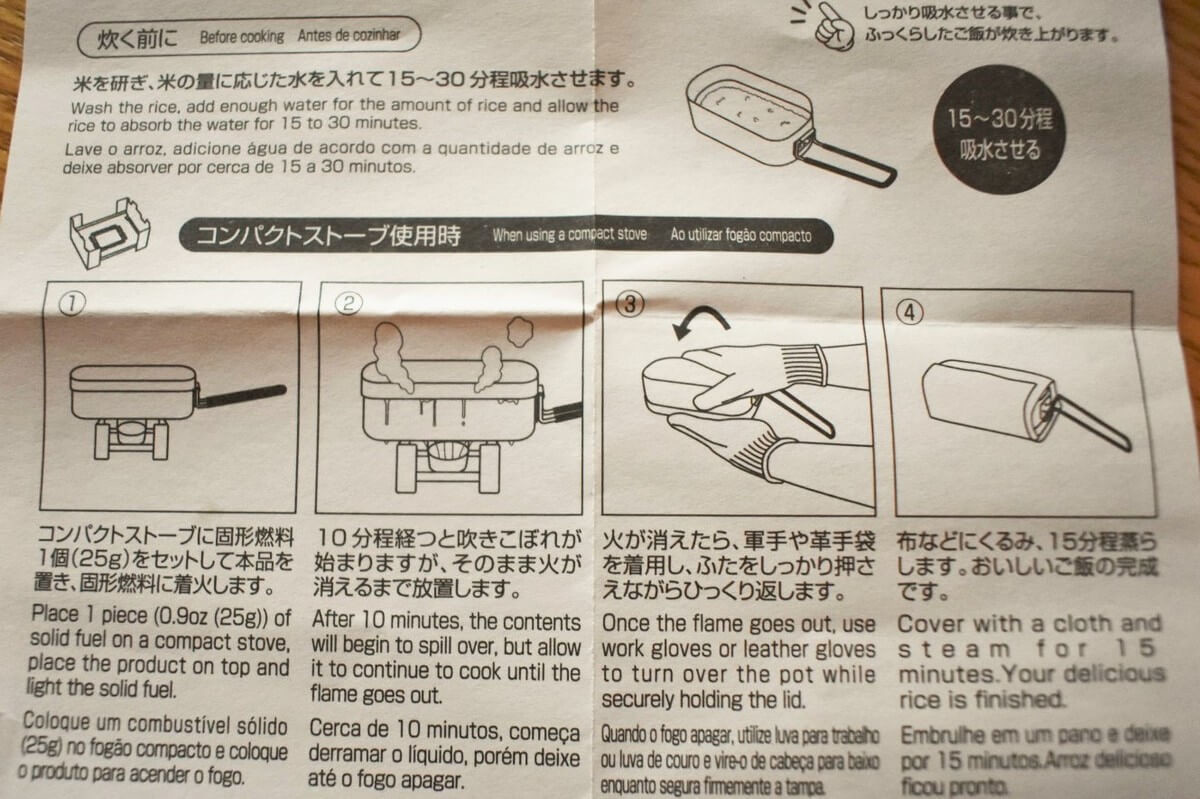 炊き方は、ダイソーメスティンの箱の中に同梱されていた「ごはんの炊き方」説明の【コンパクトストーブ使用時】を参考にしました。