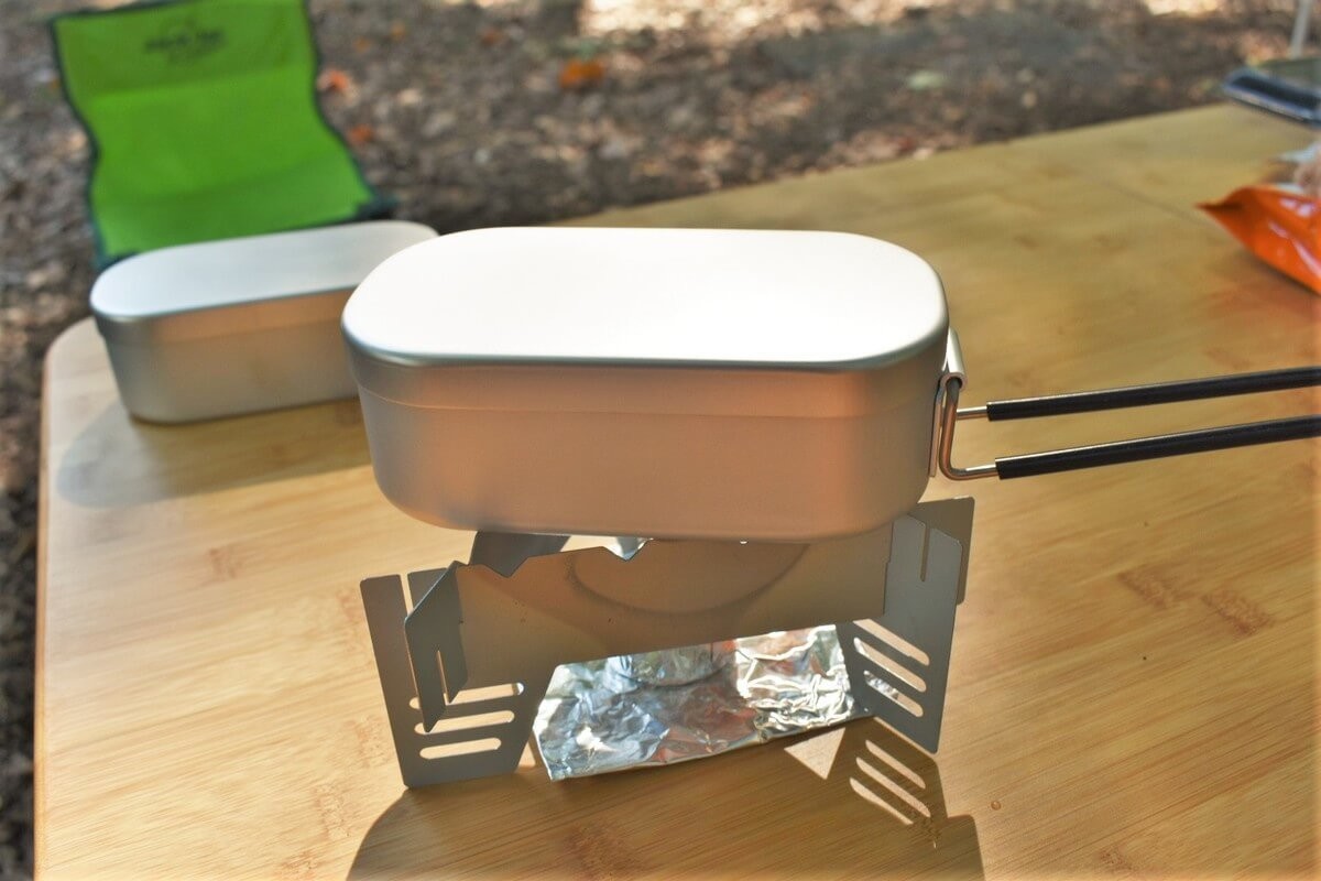 3.固形燃料に火をつけてメスティンを置く