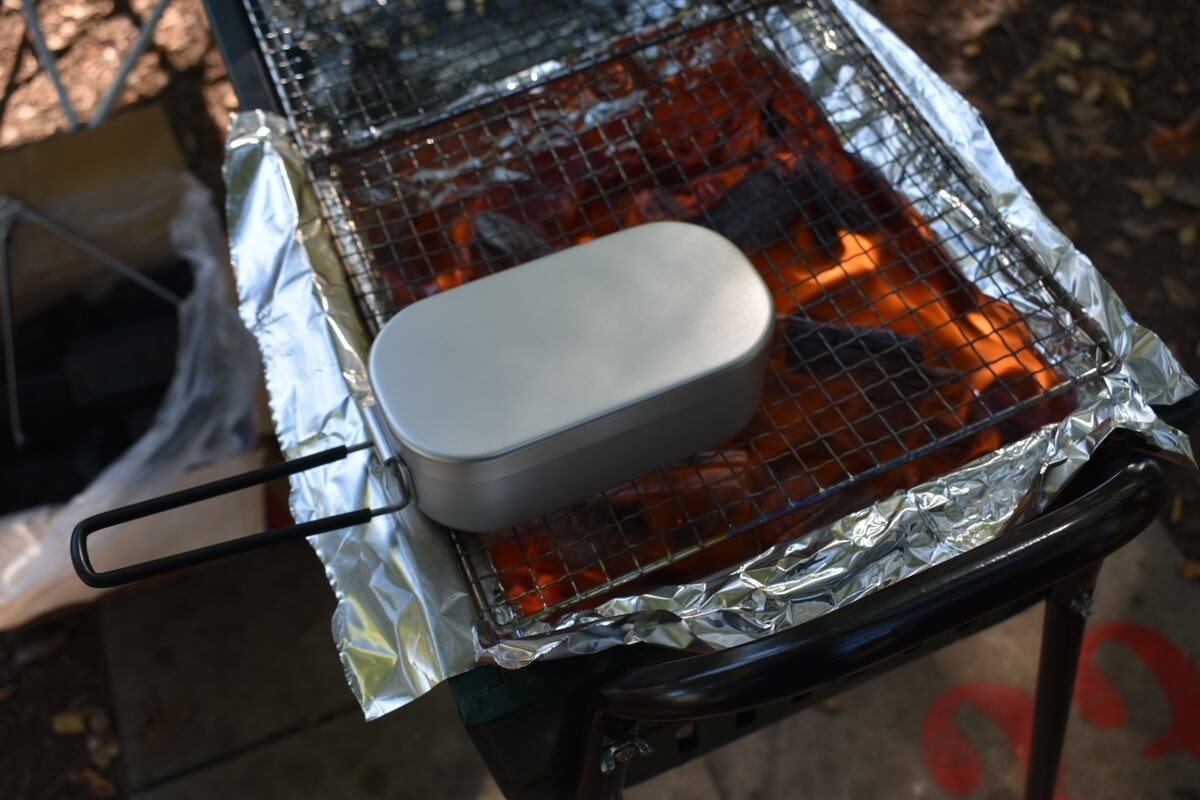 ふたを開けてみたらやはり生米状態……。急いで、メスティンを炭火のバーベキュー台に移動しました。