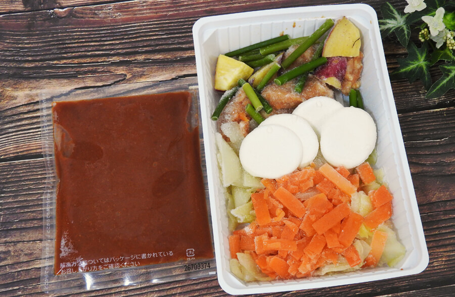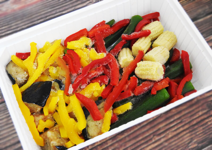 凍ったままの状態で外袋から商品を出して、透明フィルムを外し、調味液を取り出す