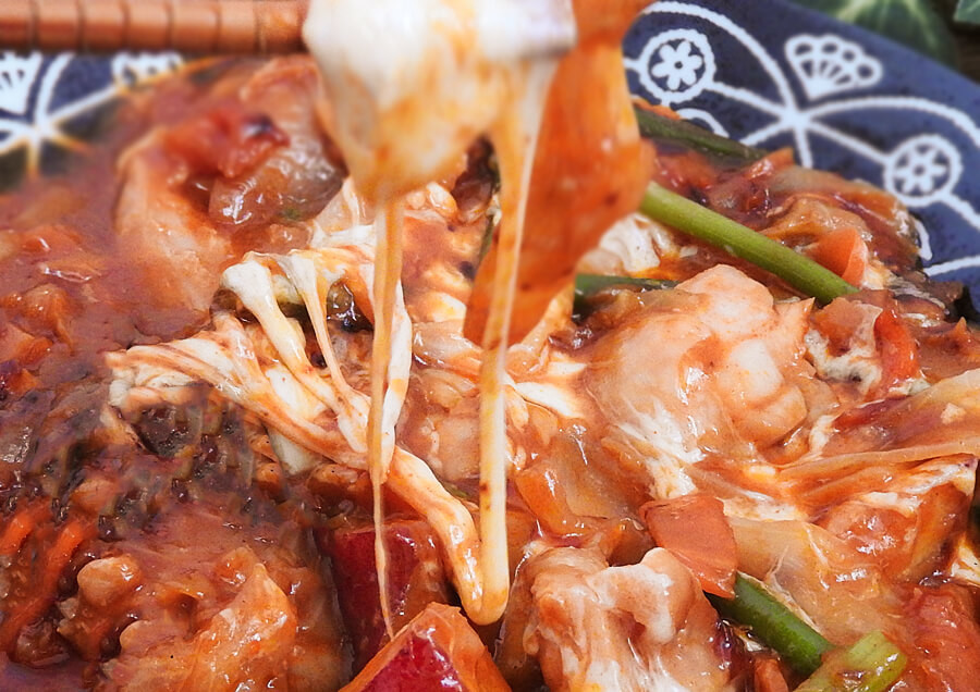 おはしで具材を持ち上げると、びろーんと伸びるチーズ。具材と絡み合ってよりマイルドな味わいに仕上がっています。