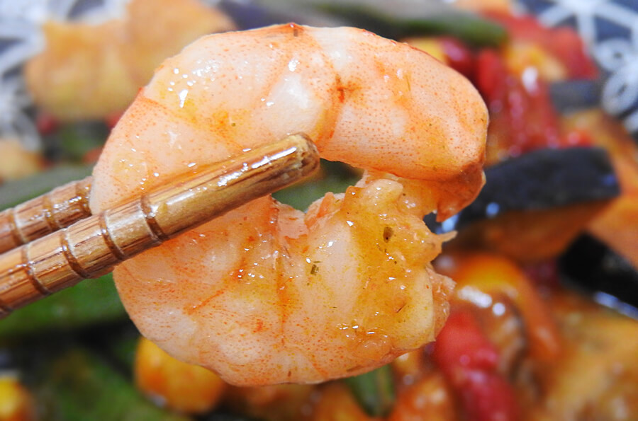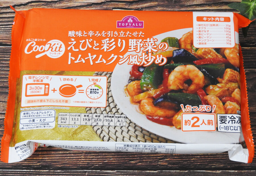 カロリーの低さ(1袋あたり343kcal)が目について即買いした「えびと彩り野菜のトムヤムクン風炒め」798円(税抜)。トムヤムクンなので辛さが気になるところですが、挑戦してみることに。