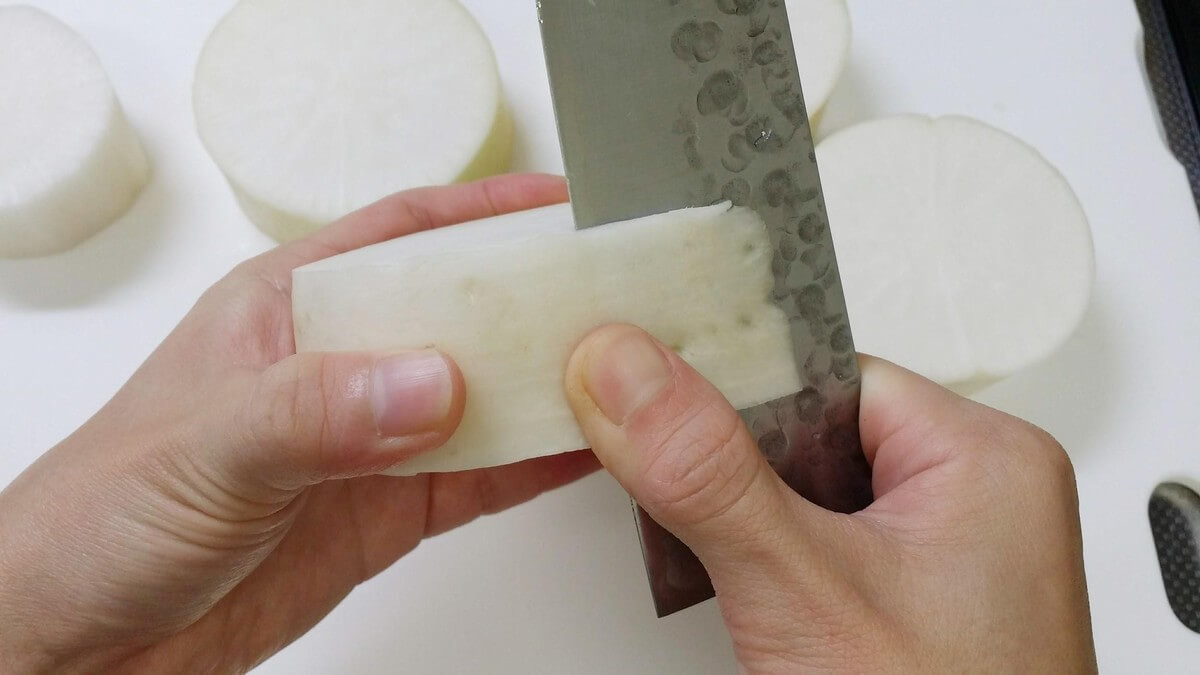 まずは大根の皮をむいて、カットしましょう。今回は煮物にするため、幅3cmの輪切りにしました。