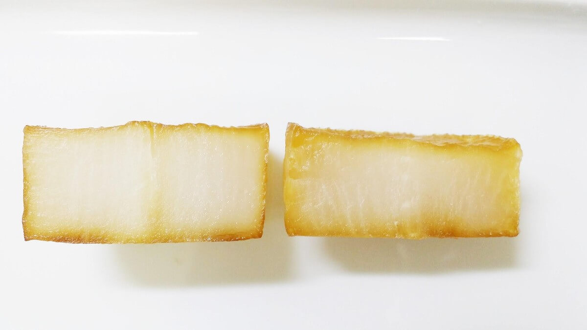 加熱後の大根の断面がこちら。表面の色はどちらも一緒でしたが、冷凍した大根は中まで煮汁がしみていて、味も期待できそう!