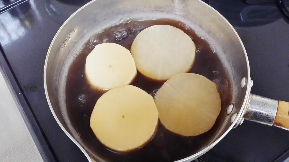 味のしみ込み具合を比較するため、同じように皮をむいて輪切りにした生の大根も一緒に煮ました。冷凍した大根は、色が少し透明ですね。ふたをして30分ほど煮てみます。