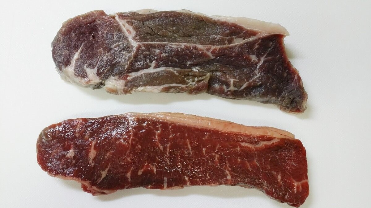 鶏むね肉と同じように、牛肉もブライン液に4時間浸けて比べてみました。上が浸けた肉です。やや色が変色してしまいましたが、それ以外の変化はとくにありません。